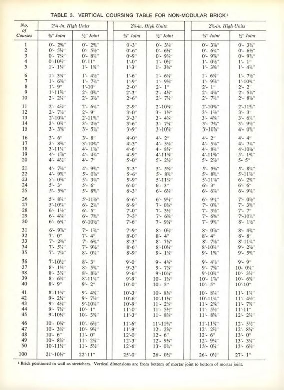 TABLE 3. VERTICAL COURSING TABLE FOR NON-MODULAR BRICK
