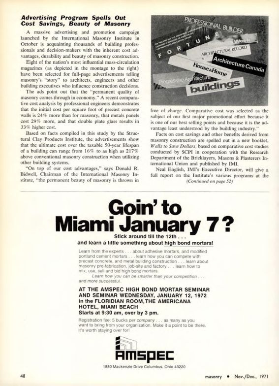 A massive advertising and promotion campaign launched by the International Masonry Institute in October is acquainting thousands of building professionals and decision-makers with the inherent cost advantages, durability and beauty of masonry construction. Eight of the nation's most influential mass-circulation magazines have been selected for full-page advertisements telling masonry's "story" to architects, engineers and other building executives who influence construction decisions.