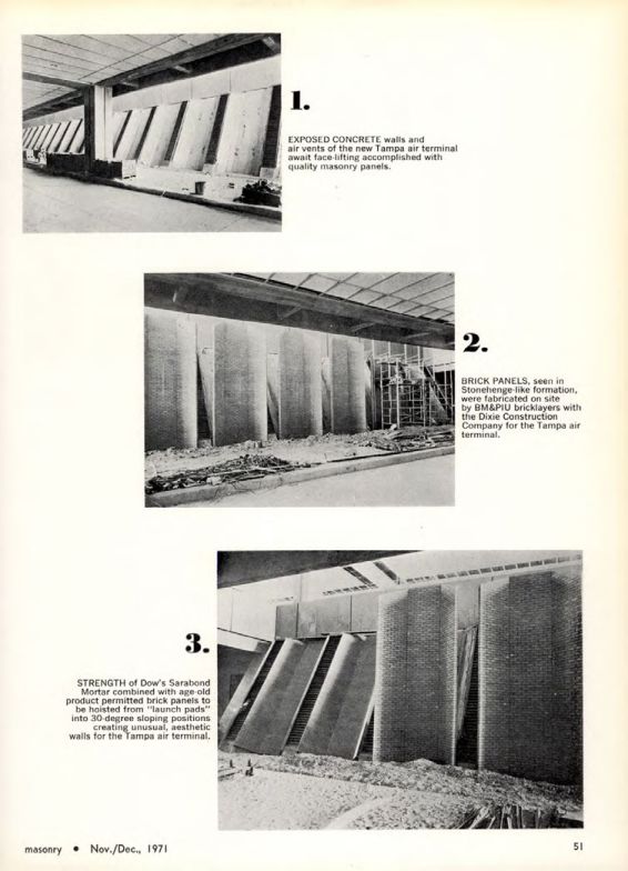 STRENGTH of Dow's Sarabond Mortar combined with age-old product permitted brick panels to be hoisted from "launch pads" into 30-degree sloping positions creating unusual, aesthetic walls for the Tampa air terminal.