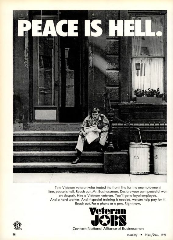 To a Vietnam veteran who traded the front line for the unemployment line, peace is hell. Reach out, Mr. Businessman. Declare your own peaceful war on despair. Hire a Vietnam veteran. You'll get a loyal employee. And a hard worker. And if special training is needed, we can help pay for it. Reach out. For a phone or a pen. Right now.