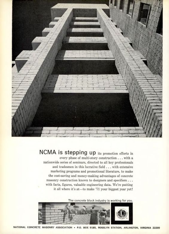 NCMA is stepping up its promotion efforts in every phase of multi-story construction... with a nationwide series of seminars, directed to all key professionals and tradesmen in this lucrative field... with extensive marketing programs and promotional literature, to make the cost-saving and money-making advantages of concrete masonry construction known to designers and specifiers with facts, figures, valuable engineering data. We're putting it all where it's at to make '71 your biggest year yet!