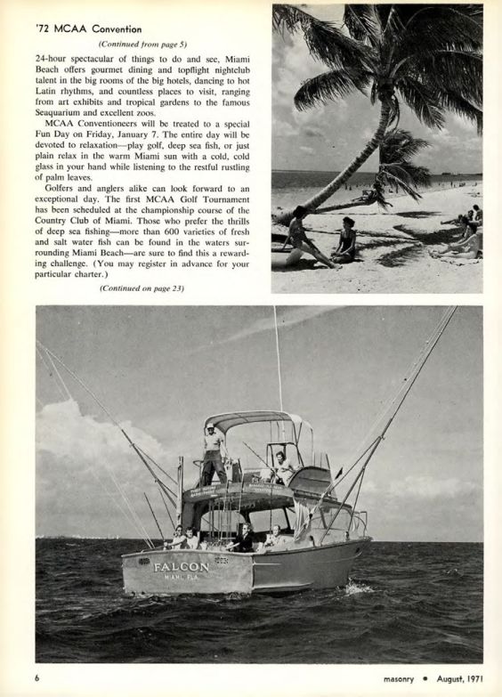 Golfers and anglers alike can look forward to an exceptional day. The first MCAA Golf Tournament has been scheduled at the championship course of the Country Club of Miami. Those who prefer the thrills of deep sea fishing more than 600 varieties of fresh and salt water fish can be found in the waters surrounding Miami Beach are sure to find this a rewarding challenge. (You may register in advance for your particular charter.)