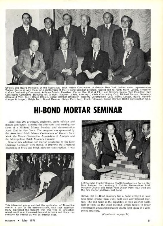 More than 200 architects, engineers, union officials and mason contractors attended the afternoon and evening sessions of a Hi-Bond Mortar Seminar and demonstration April 22nd in New York. The program was sponsored by the Associated Brick Mason Contractors of Greater New York, the Mason Contractors Association of America and the Metropolitan Brick Masonry Council.