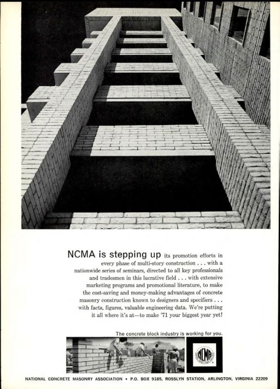 NCMA is stepping up its promotion efforts in every phase of multi-story construction with a nationwide series of seminars, directed to all key professionals and tradesmen in this lucrative field. This includes extensive marketing programs and promotional literature, to make the cost-saving and money-making advantages of concrete masonry construction known to designers and specifiers with facts, figures, valuable engineering data. We're putting it all where it's at-to make '71 your biggest year yet!