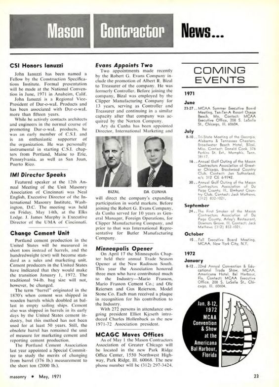 While he actively contacts architects and engineers in the normal course of promoting Dur-o-wal products, he was an early member of C.S.I. and is an enthusiastic supporter of the organization. He was personally instrumental in starting C.S.I. chapters from Portland, Maine to Erie, Pennsylvania, as well as San Juan, Puerto Rico.