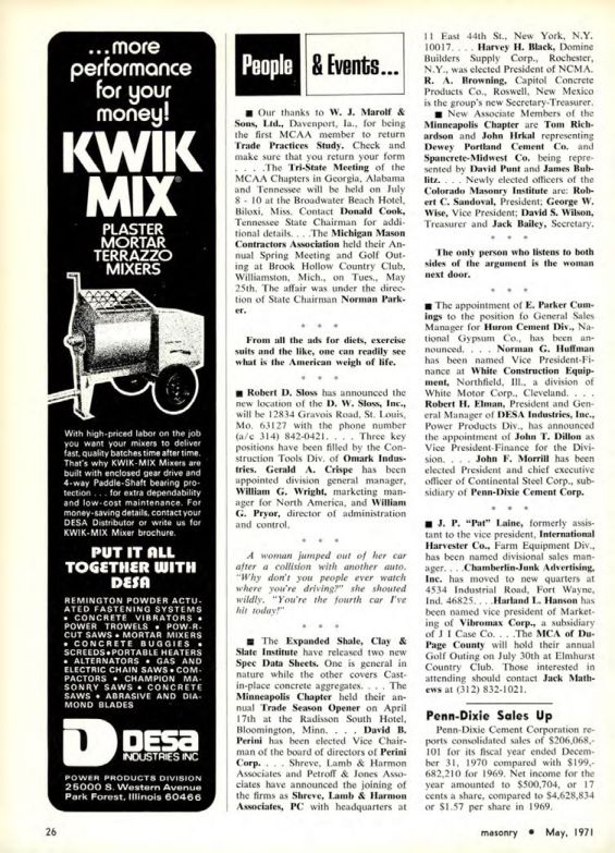 The Expanded Shale, Clay & Slate Institute have released two new Spec Data Sheets. One is general in nature while the other covers Cast-in-place concrete aggregates... The Minneapolis Chapter held their annual Trade Season Opener on April 17th at the Radisson South Hotel, Bloomington, Minn. David B. Perini has been elected Vice Chairman of the board of directors of Perini Corp. Shreve, Lamb & Harmon Associates and Petroff & Jones Associates have announced the joining of the firms as Shreve, Lamb & Harmon Associates, PC with headquarters at 11 East 44th St., New York, N.Y. 10017.... Harvey H. Black, Domine Builders Supply Corp., Rochester, N.Y., was elected President of NCMA. R. A. Browning, Capitol Concrete Products Co., Roswell, New Mexico is the group's new Secretary-Treasurer. New Associate Members of the Minneapolis Chapter are Tom Richardson and John Hrkal representing Dewey Portland Cement Co. and Spancrete-Midwest Co. being represented by David Punt and James Bublitz. Newly elected officers of the Colorado Masonry Institute are: Robert C. Sandoval, President; George W. Wise, Vice President; David S. Wilson, Treasurer and Jack Bailey, Secretary.