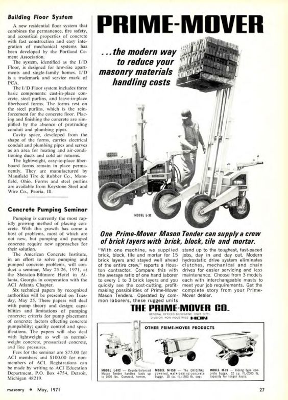 "With one machine, we supplied brick, block, tile and mortar for 15 brick layers and stayed well ahead of the entire crew," reports a Houston contractor. Compare this with the average ratio of one hand laborer to every 1 to 3 brick layers and you quickly see the cost-cutting, profit making possibilities of Prime-Mover Mason Tenders. Operated by common laborers, these rugged units stand up to the toughest, fast-paced jobs, day in and day out. Modern hydrostatic drive system eliminates clutches, mechanical and chain drives for easier servicing and less maintenance. Choose from 3 models each with interchangeable masts to meet your job requirements. Get the complete story from your Prime-Mover dealer.