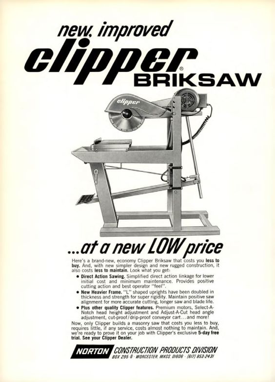 Now, only Clipper builds a masonry saw that costs you less to buy, requires little, if any service, costs almost nothing to maintain. And, we're ready to prove it on your job with Clipper's exclusive 5-day free trial. See your Clipper Dealer.