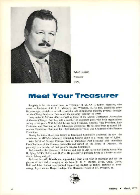 Stepping in for his second term as Treasurer of MCAA is Robert Harrison, who serves as President of G. & R. Masonry, Inc., Wheeling, III. His firm, established some 19 years ago, specializes in both residential and institutional masonry projects throughout the Chicagoland area. Bob joined the masonry industry in 1950.