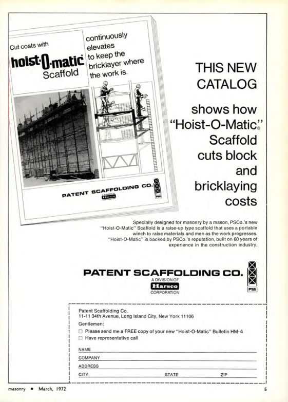 PATENT SCAFFOLDING CO. Specially designed for masonry by a mason, PSCo.'s new "Hoist-O-Matic" Scaffold is a raise-up type scaffold that uses a portable winch to raise materials and men as the work progresses. "Hoist-O-Matic" is backed by PSCo.'s reputation, built on 60 years of experience in the construction industry.
