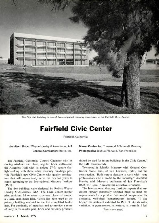 The Fairfield, California, Council Chamber with its sloping windows and clean, angular brick walls and the Assembly Hall with its unique 27-ft. square skylight along with three other masonry buildings provide Fairfield's new Civic Center with quality architecture that will economically serve the city for years to come, according to the International Masonry Institute (IMI).