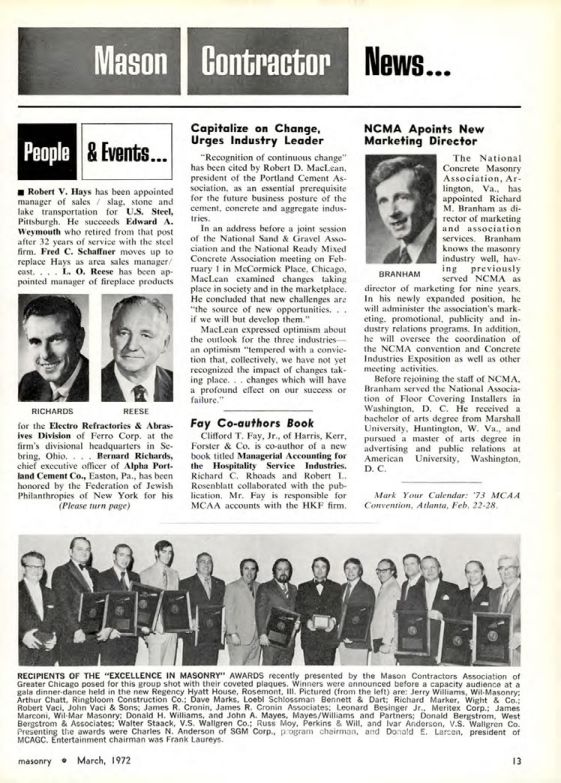 Before rejoining the staff of NCMA, Branham served the National Association of Floor Covering Installers in Washington, D. C. He received a bachelor of arts degree from Marshall University, Huntington, W. Va., and pursued a master of arts degree in advertising and public relations at American University, Washington, D. C.