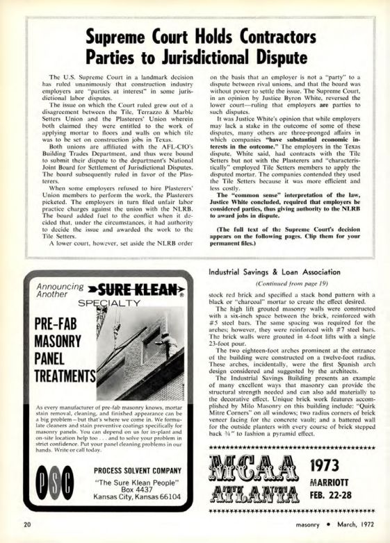 The Industrial Savings Building presents an example of many excellent ways that masonry can provide the structural strength needed and can also add materially to the decorative effect. Unique brick work features accomplished by Milo Masonry on this building include: "Quirk Mitre Corners" on all windows; two radius corners of brick veneer facing for the concrete vault; and a battered wall for the outside planters with every course of brick stepped back 4" to fashion a pyramid effect.