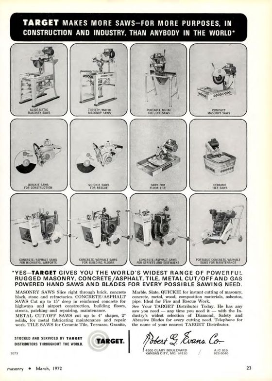 *YES-TARGET GIVES YOU THE WORLD'S WIDEST RANGE OF POWERFUL RUGGED MASONRY, CONCRETE/ASPHALT, TILE, METAL CUT/OFF AND GAS POWERED HAND SAWS AND BLADES FOR EVERY POSSIBLE SAWING NEED.