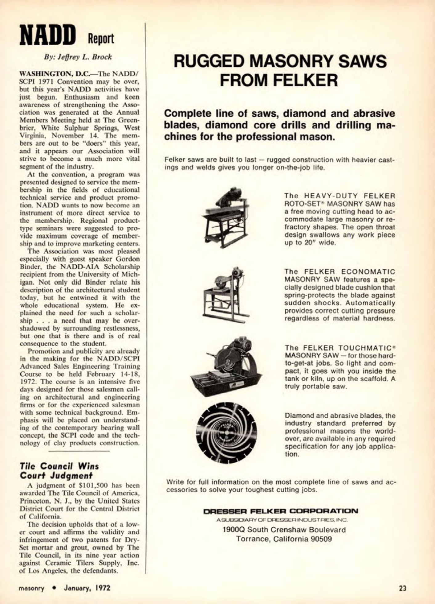 The decision upholds that of a lower court and affirms the validity and infringement of two patents for Dry-Set mortar and grout, owned by The Tile Council, in its nine year action against Ceramic Tilers Supply, Inc. of Los Angeles, the defendants.