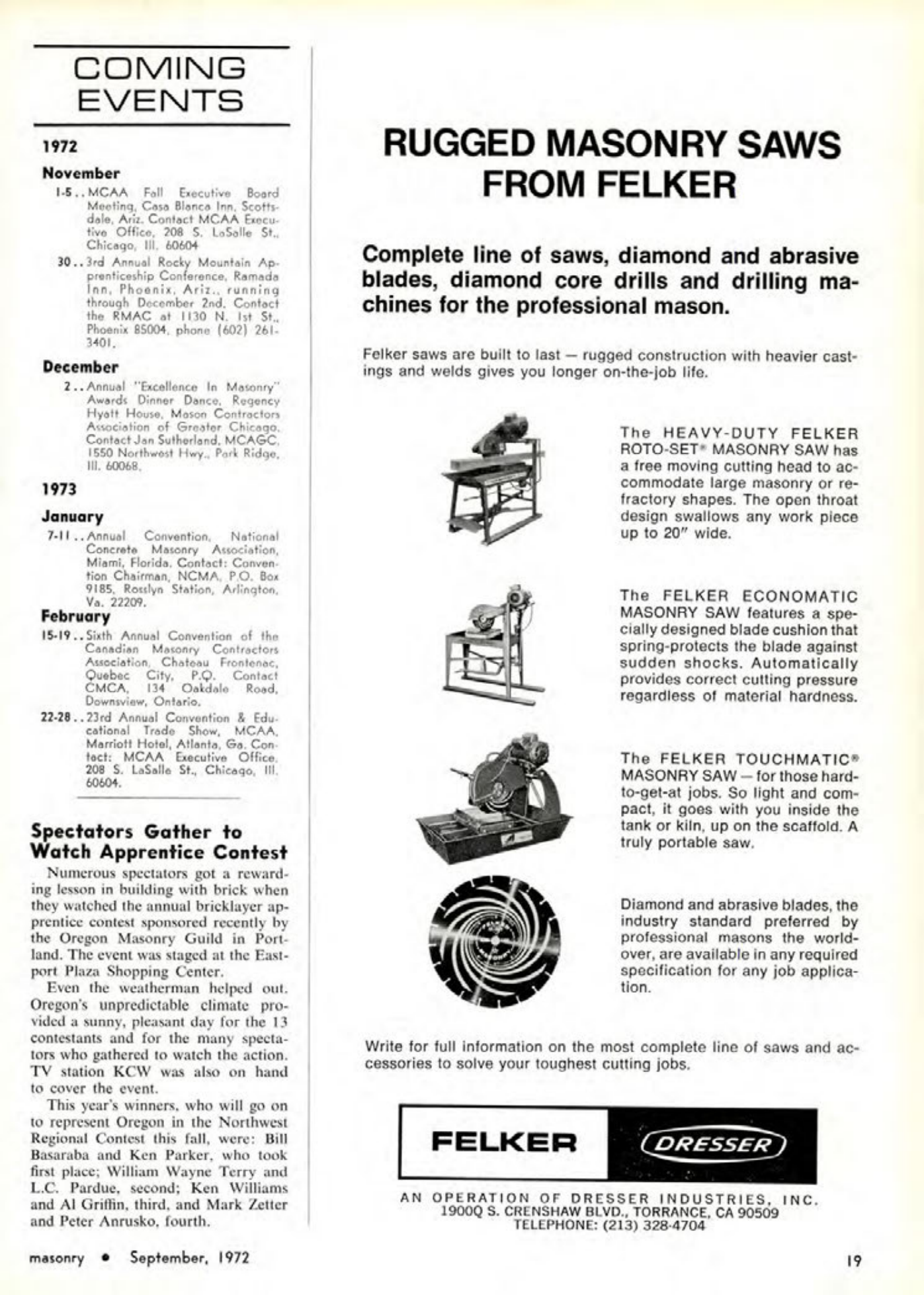 2.. Annual "Excellence In Masonry" Awards Dinner Dance, Regency Hyatt House, Mason Contractors Association of Greater Chicago. Contact Jan Sutherland, MCAGC, 1550 Northwest Hwy., Park Ridge, 60068.