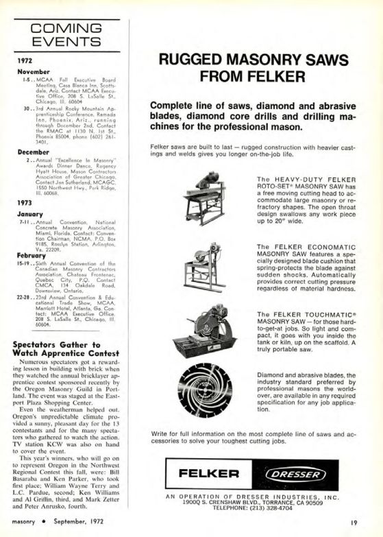 The FELKER TOUCHMATIC MASONRY SAW-for those hard-to-get-at jobs. So light and compact, it goes with you inside the tank or kiln, up on the scaffold. A truly portable saw.