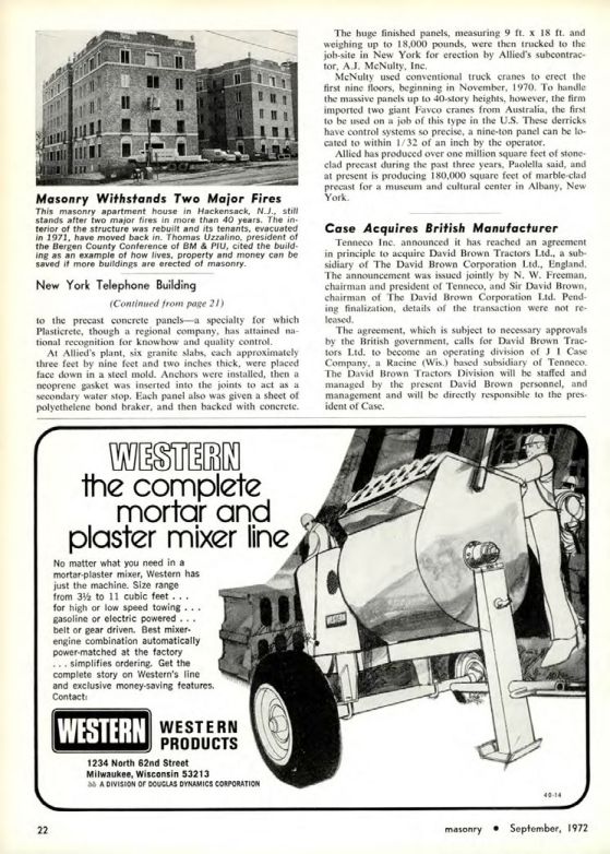 No matter what you need in a mortar-plaster mixer, Western has just the machine. Size range from 332 to 11 cubic feet for high or low speed towing gasoline or electric powered belt or gear driven. Best mixer-engine combination automatically power-matched at the factory simplifies ordering. Get the complete story on Western's line and exclusive money-saving features. Contact: WESTERN WESTERN PRODUCTS 1234 North 62nd Street Milwaukee, Wisconsin 53213 A DIVISION OF DOUGLAS DYNAMICS CORPORATION