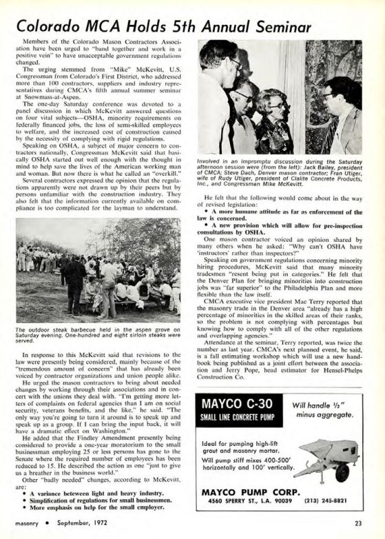 Members of the Colorado Mason Contractors Association have been urged to "band together and work in a positive vein" to have unacceptable government regulations changed. The urging stemmed from "Mike" McKevitt, U.S. Congressman from Colorado's First District, who addressed more than 100 contractors, suppliers and industry representatives during CMCA's fifth annual summer seminar at Snowmass-at-Aspen.