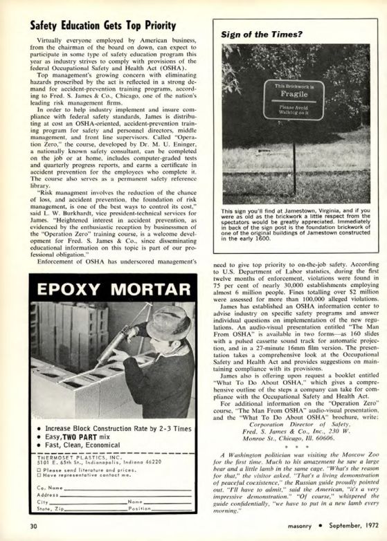 For additional information on the "Operation Zero" course, "The Man From OSHA" audio-visual presentation, and the "What To Do About OSHA" brochure, write: Corporation Director of Safety, Fred. S. James & Co., Inc., 230 W. Monroe St., Chicago, III, 60606.