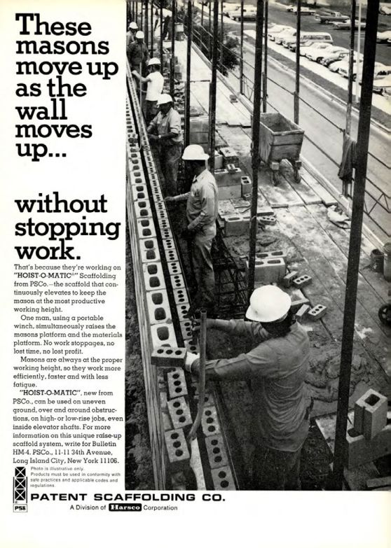 "HOIST-O-MATIC", new from PSCo., can be used on uneven ground, over and around obstructions, on high-or low-rise jobs, even inside elevator shafts. For more information on this unique raise-up scaffold system, write for Bulletin HM-4. PSCo., 11-11 34th Avenue, Long Island City, New York 11106.