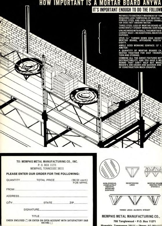 Combine all the above features with indestructibility, and you have a mortar board that can't help but make the mason's job easier and quicker and the cost of construction much cheaper.