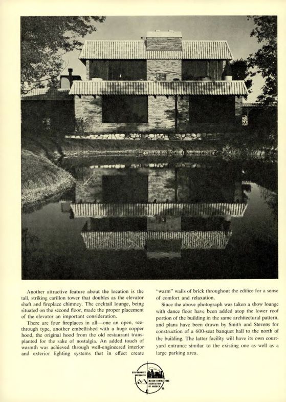 Since the above photograph was taken a show lounge with dance floor have been added atop the lower roof portion of the building in the same architectural pattern, and plans have been drawn by Smith and Stevens for construction of a 600-seat banquet hall to the north of the building. The latter facility will have its own courtyard entrance similar to the existing one as well as a large parking area.