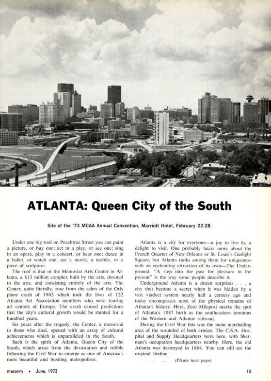 The roof is that of the Memorial Arts Center in Atlanta, a $13 million complex built by the arts, devoted to the arts, and consisting entirely of the arts. The Center, quite literally, rose from the ashes of the Orly plane crash of 1962 which took the lives of 122 Atlanta Art Association members who were touring art centers of Europe. The crash caused predictions that the city's cultural growth would be stunted for a hundred years.