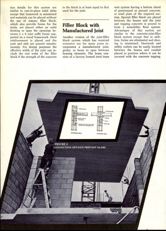 Design and construction details for this system are similar to cast-in-place solid slabs except that formwork is minimized and materials can be placed without the use of cranes; filler block, which also provide forms for the joists, are placed either on solid decking or span the openings between 2 x 8 joist soffit forms supported on a wood framework. Steel reinforcement is placed and the joist and slab are poured simultaneously. For design purposes the effective width of the joist can include the end webs of the filler block if the strength of the concrete in the block is at least equal to that used for the joist.