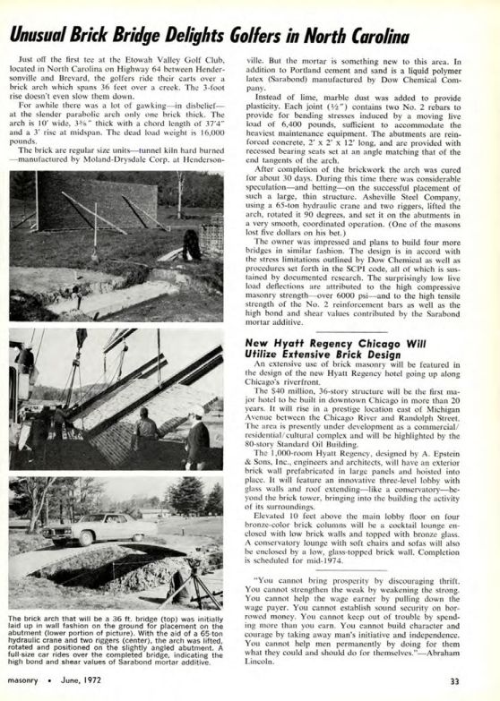 The owner was impressed and plans to build four more bridges in similar fashion. The design is in accord with the stress limitations outlined by Dow Chemical as well as procedures set forth in the SCPI code, all of which is sustained by documented research. The surprisingly low live load deflections are attributed to the high compressive masonry strength over 6000 psi and to the high tensile strength of the No. 2 reinforcement bars as well as the high bond and shear values contributed by the Sarabond mortar additive.