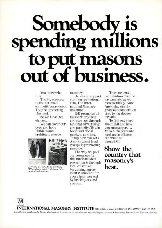 You know who it is. The big corporations that make competitive products. They're promoting like mad. So we have two choices. We can cover our eyes and hope builders and architects choose masonry. Or we can support our own promotional arm, The International Masonry Institute.