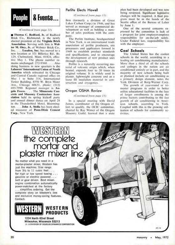 Thomas C. Redford, Jr. of Redford Brick Co., Richmond, is the newly elected president of the Virginia Brick Association. Serving with him is Walter M. Otey, Jr. of Webster Brick Co., Inc. Lusalon, Ine. has moved to a new location at 321 Billerica Rd., Rt. 129, Chelmsford, Mass. 01824, effective May 1. The phone number remains unchanged: 272-9360. Also doing business in new quarters is the Laborers' International Union of North America which relocated its Chicago and Central Canada regional office on May 1 to Suite 316, International Tower Building, 8550 W. Bryn Mawr Ave., Chicago 60631, phone: (312) 693-7990. Regional manager is Angelo Fosco.