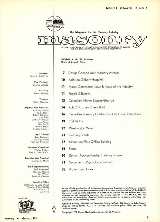 As the official publication of the Mason Contractors Association of America, masonry publishes authoritative announcements and articles concerning activities of the MCAA. Statements and opinions expressed in editorials or articles by the editors and contributors do not necessarily represent the official position of the MCAA, and the publication of advertising does not imply endorsement of products advertised nor statements made concerning them.