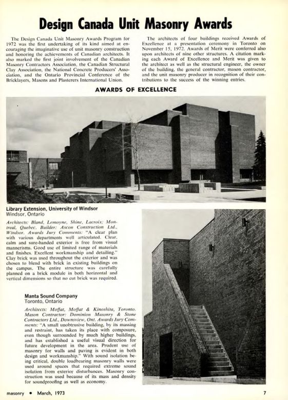 The Design Canada Unit Masonry Awards Program for 1972 was the first undertaking of its kind aimed at encouraging the imaginative use of unit masonry construction and honoring the achievements of Canadian architects. It also marked the first joint involvement of the Canadian Masonry Contractors Association, the Canadian Structural Clay Association, the National Concrete Producers' Association, and the Ontario Provincial Conference of the Bricklayers, Masons and Plasterers International Union.