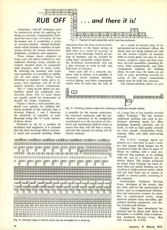 Adopting a "rub-off" technique used by commercial artists for applying lettering to artwork, Construction Technical Services Corp. of Canton, III. has developed and is marketing a series of masonry-module "instant-drafting" sheets which include a number of time-saving devices for mason contractors, draftsmen, architects and engineers.