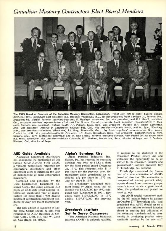 The 1973 Board of Directors of the Canadian Masonry Contractors Association. (Front row, left to right) Eugene George, Kitchener, Ont., immediate past-president; R.E. Beaupre, Vancouver, B.C., 1st vice president; Frank Camisso, Jr., Toronto, Ont., president; P.L. Martini, Toronto, secretary-treasurer: D. Maniago, Vancouver, 2nd vice president, and R.B. Beach, Hamilton, Ont., associate members' representative. (2nd row) R.H. Grimm, Toronto, concrete block suppliers representative: T. Mascarin, Toronto, vice president-Ontario South; P.P. Palardy, Laval, Que., vice president-Quebec; R.H. Welch, Edmonton, Alta., vice president-Alberta; D. Gasparotto, Thunder Bay, Ont., vice president-Ontario North, and M. Egan, Winnipeg, Man., vice president-Manitoba. (Back row) row) S.J. Gray, Streetsville, Ont., clay brick suppliers' representative; W.J. Young, Fredericton, N.B., vice president-Atlantic Provinces; L.R. Jones, Saskatoon, Sask., president-Saskatchewan; K. Pohl, Calgary, Alta., 1974 conference chairman; and W. Neil Fraser, Toronto, executive director. Also elected but not shown were R.J. Hillis, Vancouver, vice president-British Columbia; R.L. Graham, Moose Jaw, Sask., director at large, and J. Deutsch, Windsor, Ont., director at large.