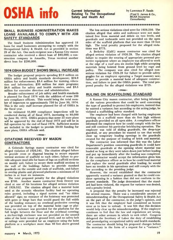 The Small Business Administration has approved 18 loans for small businesses attempting to comply with the Occupational Safety & Health Act as provided in section 28 of the Act. One such recipient was a Kansas City mason contractor who received a direct loan of $43,000; a construction company in Amarillo, Texas received another direct loan for $200,000.