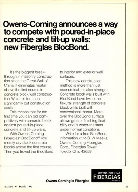 Write for a free BlocBond information kit to B. W. Meeks, Owens-Corning Fiberglas Corp., Fiberglas Tower, Toledo, Ohio 43659.
