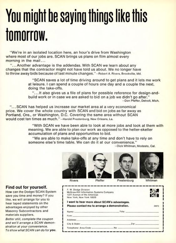 "... Another advantage is the addendas. With SCAN we learn about any changes that the contractor might not have told us about. We no longer have to throw away bids because of last minute changes."-Robert A. Rivers, Brookville, Md.