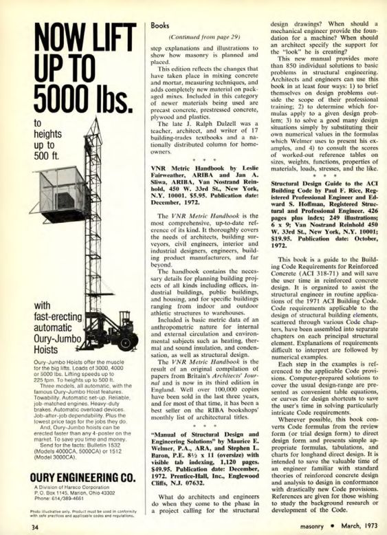 "Manual of Structural Design and Engineering Solutions" by Maurice E. Welmer, P.A., ARA, and Stephen L. Baron, P.E. 8½ x 11 (oversize) with visible tab indexing, 1,120 pages. $49.95. Publication date: December, 1972. Prentice-Hall, Inc., Englewood Cliffs, N.J. 07632.