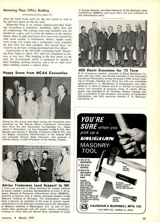 A brick wall provides a fitting backdrop as Joseph Caldwell of Adrian (center), business representative of Local 3, Brick layers, Masons & Plasterers International Union (BM&PIU), presents a check to John A. Heslip, executive director of the Masonry Institute of Michigan. The presentation resulted from a decision by members of the local to include regular contributions to the Michigan institute and to the International Masonry Institute in Washington, D.C. as part of their recent labor agreement with the area's mason contractors. Looking on (from left) are Warren Bice, president of Local