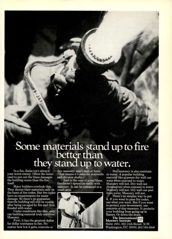First, it has the greatest dollar for dollar resistance to fire. No matter how hot it gets, concrete or clay masonry won't melt or burn. (That means it's safer for stairwells and elevator shafts.)