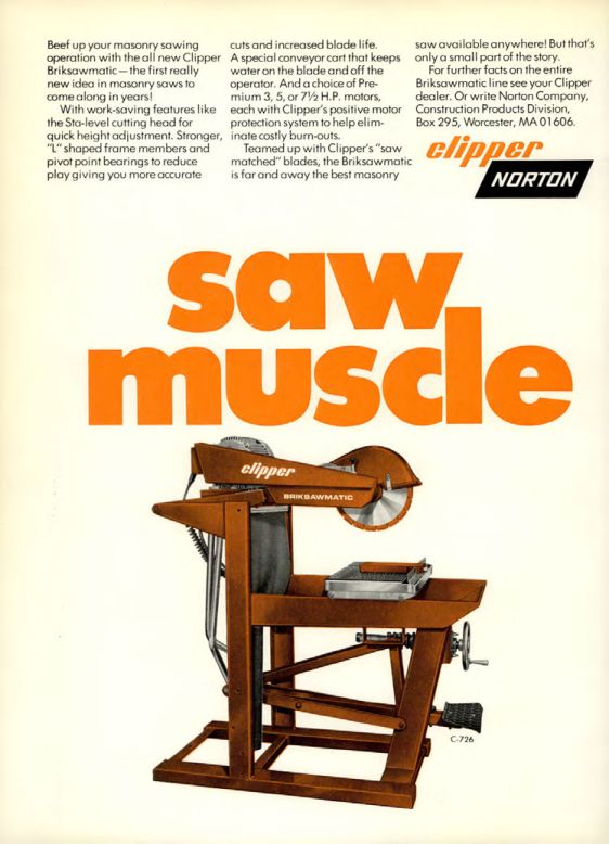 Teamed up with Clipper's "saw matched" blades, the Briksawmatic is far and away the best masonry saw available anywhere! But that's only a small part of the story. For further facts on the entire Briksawmatic line see your Clipper dealer. Or write Norton Company, Construction Products Division, Box 295, Worcester, MA 01606.