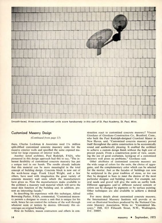 In describing his experience with this technique, Alfred Browning Parker, FAIA, commented, "Customized masonry permits a designer to create a unit that is unique for his work, hence he can control the richness of the wall through whatever scale or texture he desires. Obviously this encourages an original building."