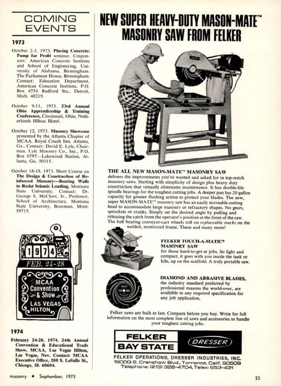 October 12, 1973. Masonry Showcase presented by the Atlanta Chapter of MCAA, Royal Coach Inn, Atlanta, Ga., Contact: David E. Lyle, Chairman, Lyle Masonry Co., Inc., P.O. Box 6797-Lakewood Station, Atlanta, Ga. 30315.