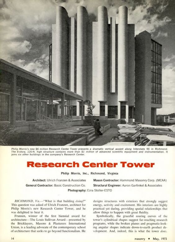 Philip Morris's new $6 million Research Center Tower presents a dramatic vertical accent along Interstate 95 in Richmond. The 8-story, 120-ft. high structure contains more than $1 million of advanced scientific equipment and instrumentation. It joins six other buildings in the company's Research Center.