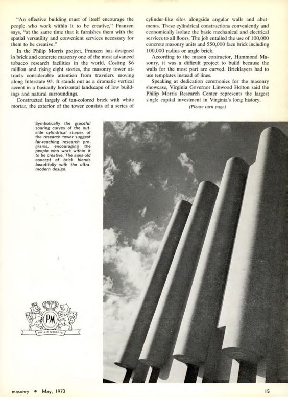 In the Philip Morris project, Franzen has designed in brick and concrete masonry one of the most advanced tobacco research facilities in the world. Costing $6 million and rising eight stories, the masonry tower attracts considerable attention from travelers moving along Interstate 95. It stands out as a dramatic vertical accent in a basically horizontal landscape of low buildings and natural surroundings.