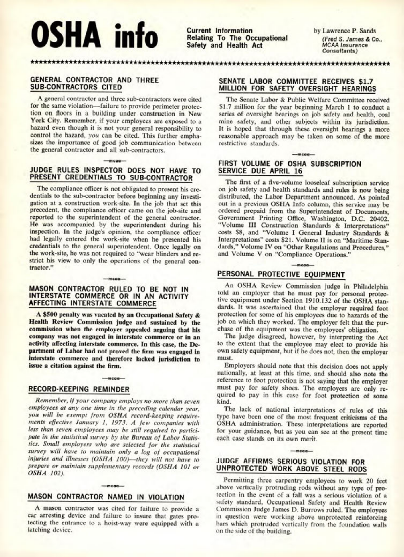The first of a five-volume looseleaf subscription service on job safety and health standards and rules is now being distributed, the Labor Department announced. As pointed out in a previous OSHA Info column, this service may be ordered prepaid from the Superintendent of Documents, Government Printing Office, Washington, D.C. 20402. "Volume III Construction Standards & Interpretations" costs $8, and "Volume 1 General Industry Standards & Interpretations" costs $21. Volume II is on "Maritime Standards," Volume IV on "Other Regulations and Procedures," and Volume V on "Compliance Operations."