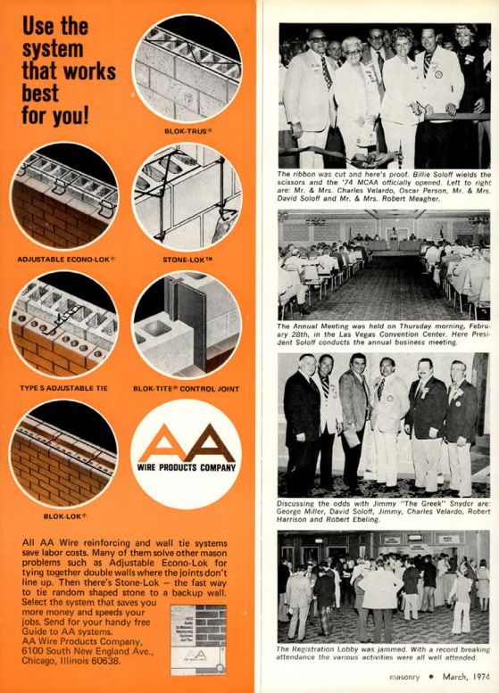 All AA Wire reinforcing and wall tie systems save labor costs. Many of them solve other mason problems such as Adjustable Econo-Lok for tying together double walls where the joints don't line up. Then there's Stone-Lok the fast way to tie random shaped stone to a backup wall. Select the system that saves you more money and speeds your jobs. Send for your handy free Guide to AA systems.