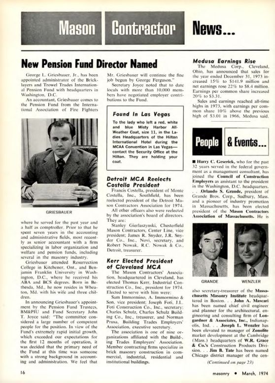 Orlando S. Grande, president of Grande Bros. Corp., Sudbury, Mass. and a pioneer of industry promotion in Massachusetts, has been elected president of the Mason Contractors Association of Massachusetts. He is also secretary-treasurer of the Massachusetts Masonry Institute headquartered in Boston. John A. Mascari has been named chief civil engineer and planner for the architectural, engineering and consulting firm of Longardner & Associates, Inc., Indianapolis, Ind. Joseph L. Wenzler has been elevated to manager of Zonolite market development at the Cambridge (Mass.) headquarters of W.R. Grace & Co.'s Construction Products Division... Jim B. Tate has been named Chicago district manager of the cen- (Continued on page 23)